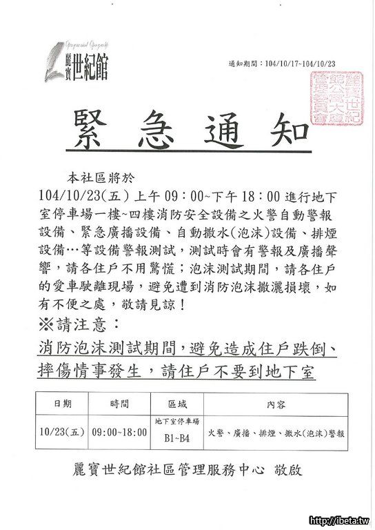 通知 :B1-B4火警 廣播 排煙 撒水泡沫警報測試