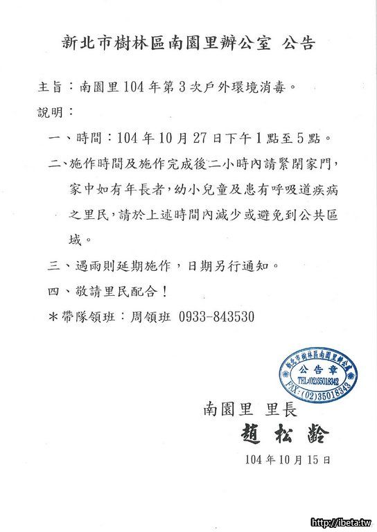 南園里104年10月27日第三次戶外消毒環境公告