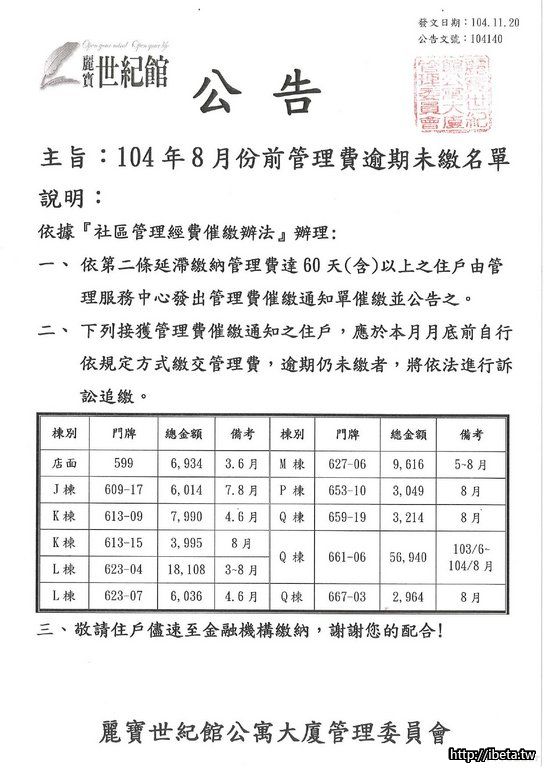 104140 104年8月份前管理費逾期未繳名單