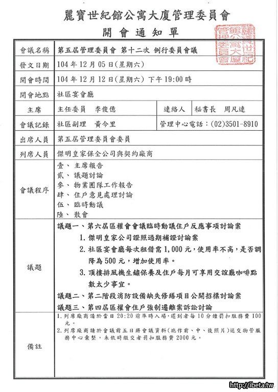 第五屆管理委員會 第十二次例行會議開會通知單