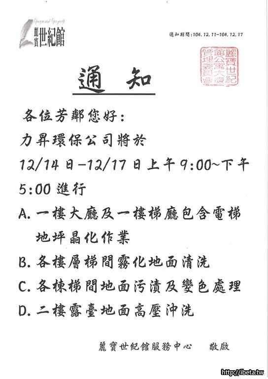通知 :力昇環保公司對社區進行地坪晶化作業