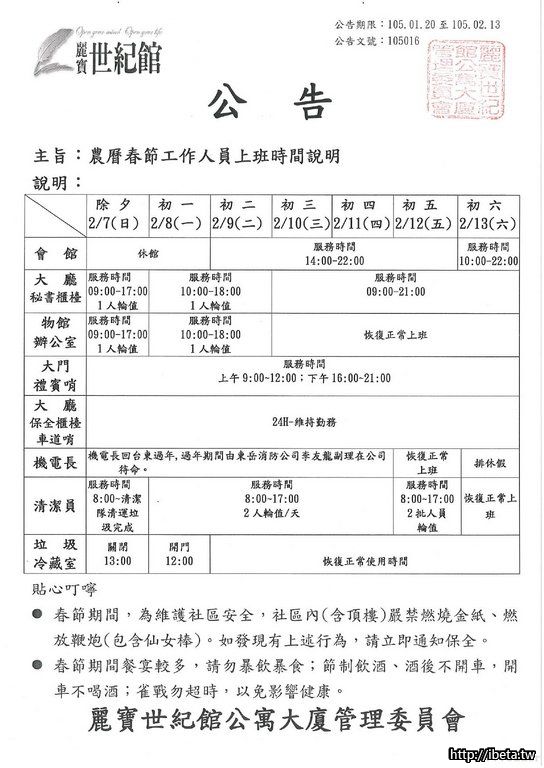 105016 農曆春節工作人員上班時間說明