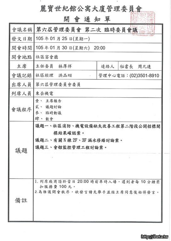 第六屆管理委員會 第二次臨時委員會議 開會通知單