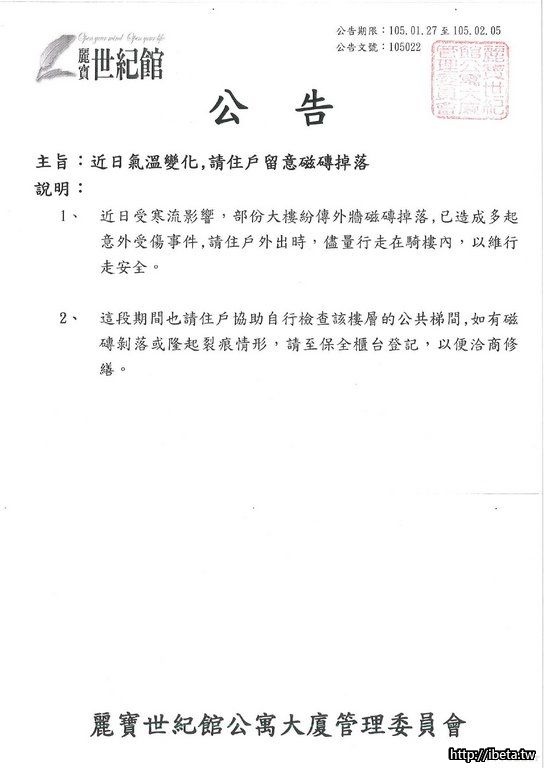 105022 近日氣溫變化,請住戶留意磁磚掉落。