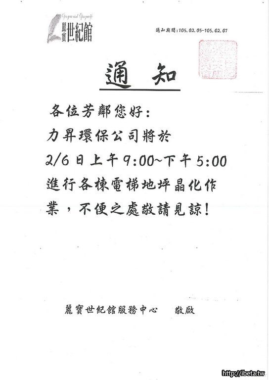 通知 02/06 各棟電梯地坪晶化作業