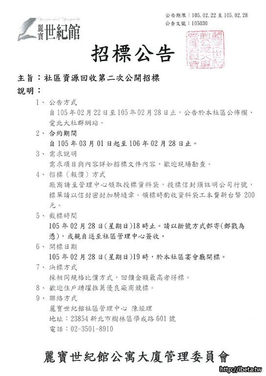 105030 社區資源回收第二次招標公告