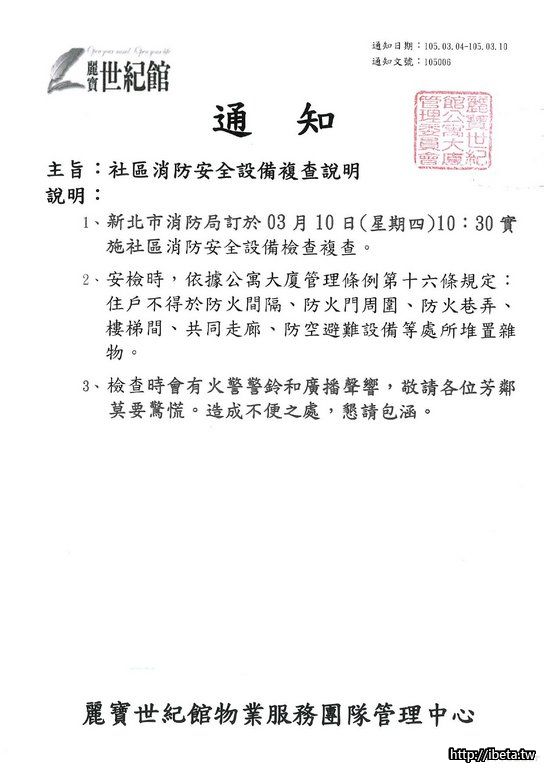 通知 105006 社區消防安全設備複查說明