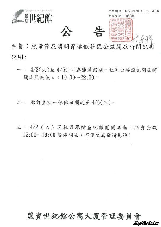105034 兒童節及清明節連假社區公設開放時間說明