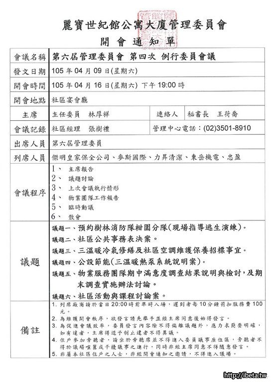 第六屆管理委員會 第四例行委員會議 開會通知單