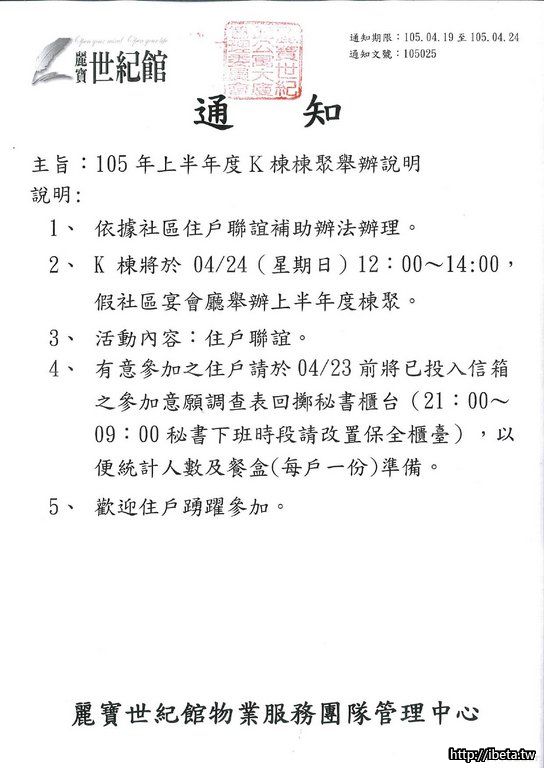 通知 105025 105年上半年度K棟棟聚舉辦說明