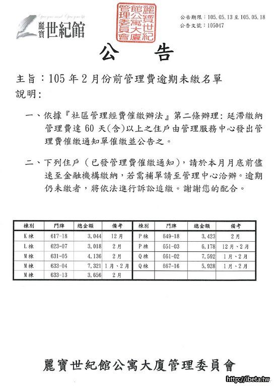 105047 105年2月份前管理費逾期未繳名單