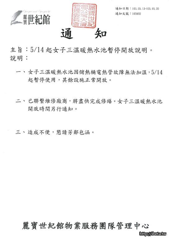 通知 105032 5月14日起女子三溫暖熱水池暫停開放說明