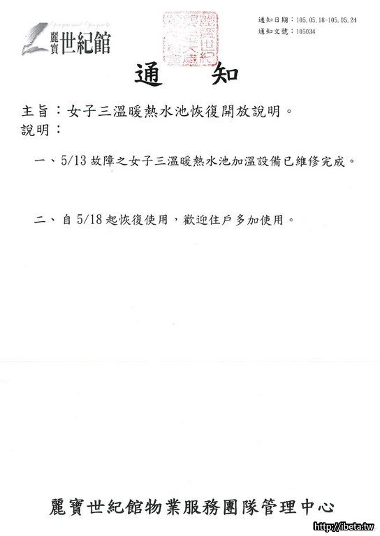 通知 105034 女子三溫暖熱水池恢復開放說明
