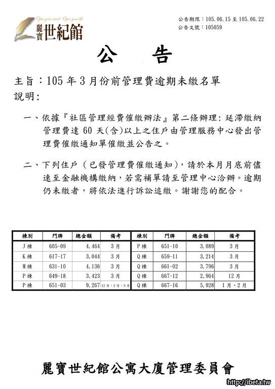 105059 105年3月份前管理費逾期未繳名單