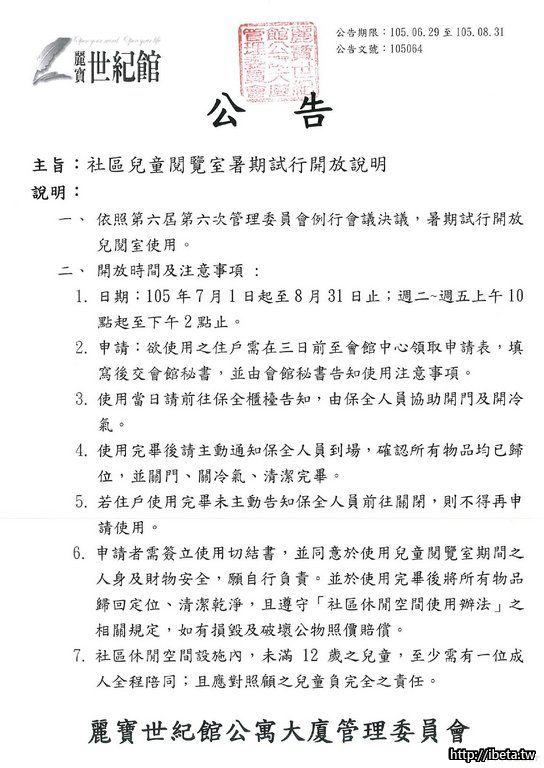 105064 社區兒童閱覽室暑期試行開放說明