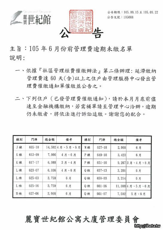 105088 105年6月份前管理費逾期未繳名單