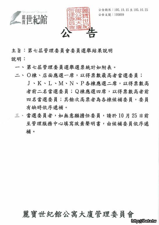 105099 第七屆管理委員會委員選舉結果說明