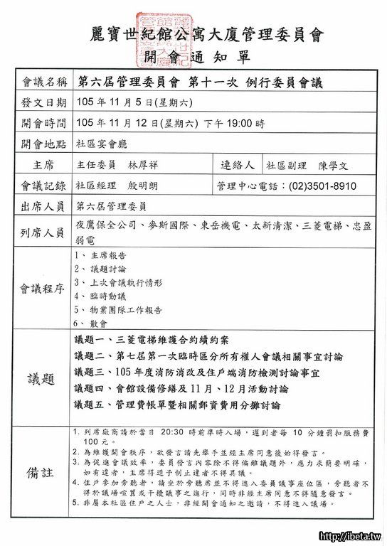 第六屆管委會第十一次例行會議通知
