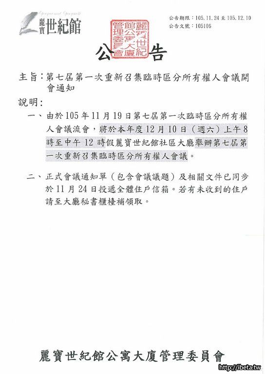 第七屆第一次重新招集臨時區分所有權人會議開會通知