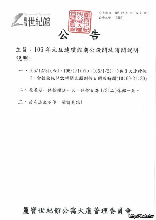 106001 106年元旦連續假期公設開放時間說明