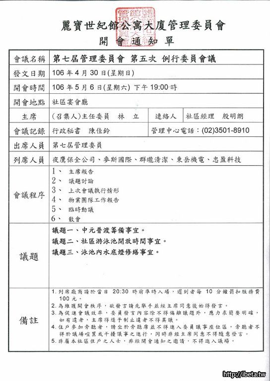 第七屆管理委員會 第五次例會開會通知單