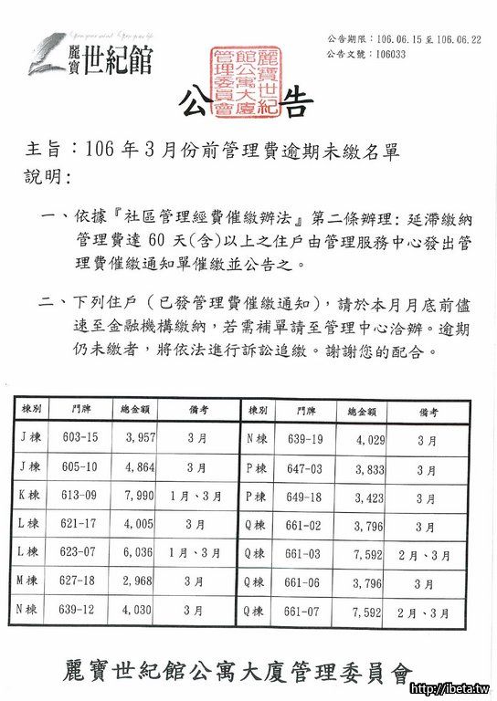 106033 106年3月份前管理費逾期未繳名單