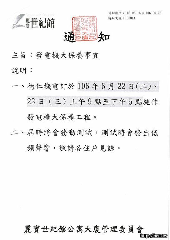 通知 106014 發電機大保養事宜