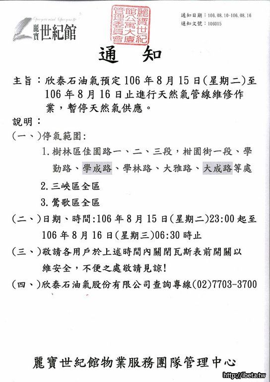 通知106015 欣泰天然氣預定於106年8月15日至16日暫停天然氣