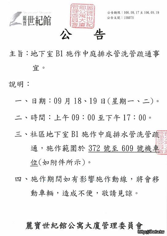 106070 地下室B1施作中庭排水管洗管疏通事宜