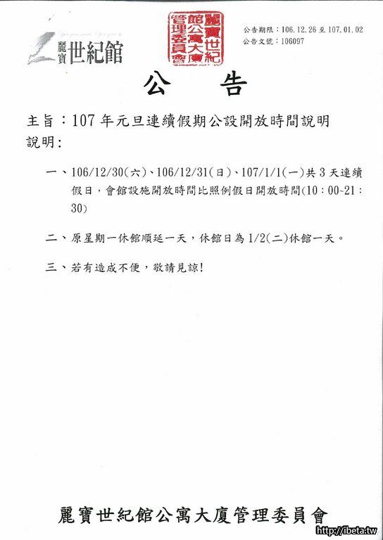 106097 107年元旦連續假期公設開放時間說明