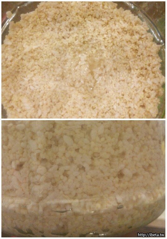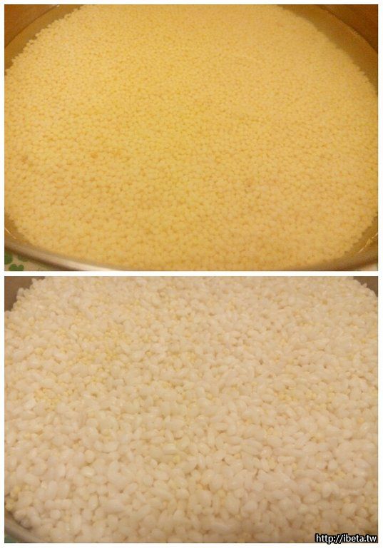 小米、圓糯米,洗凈後先泡水一夜。
