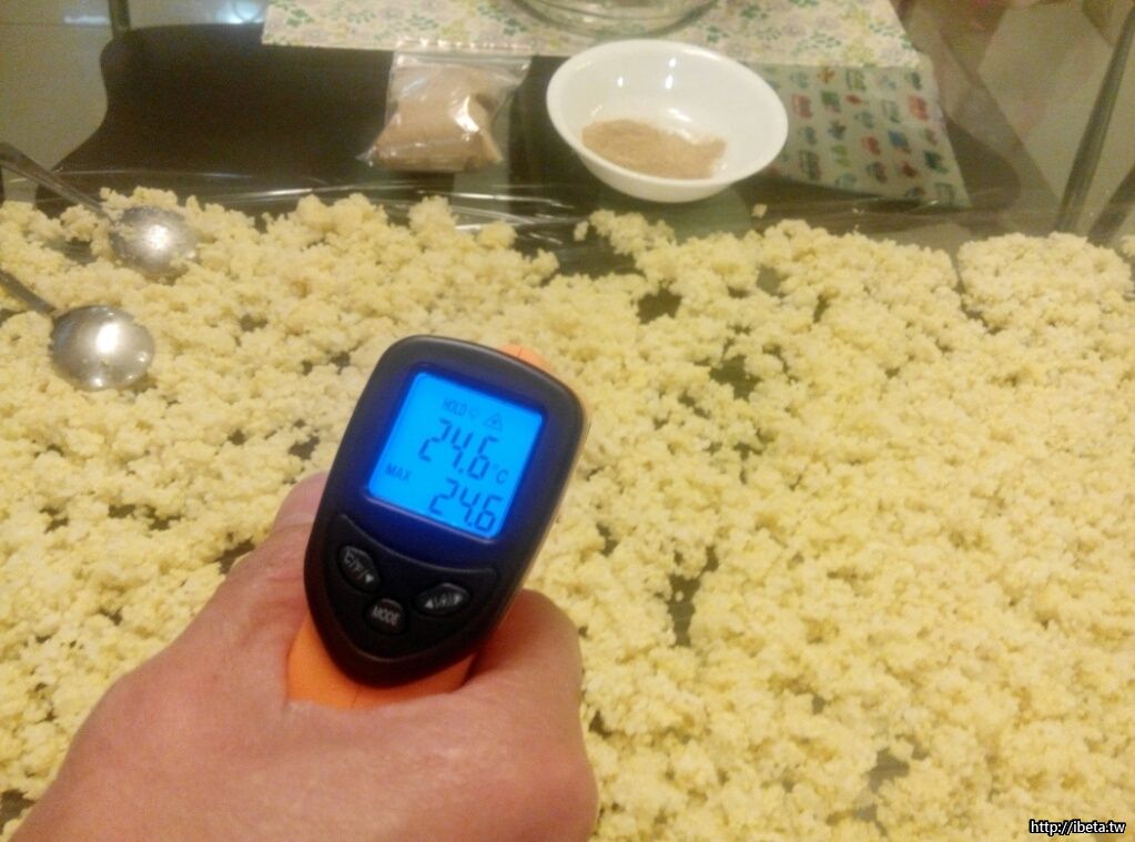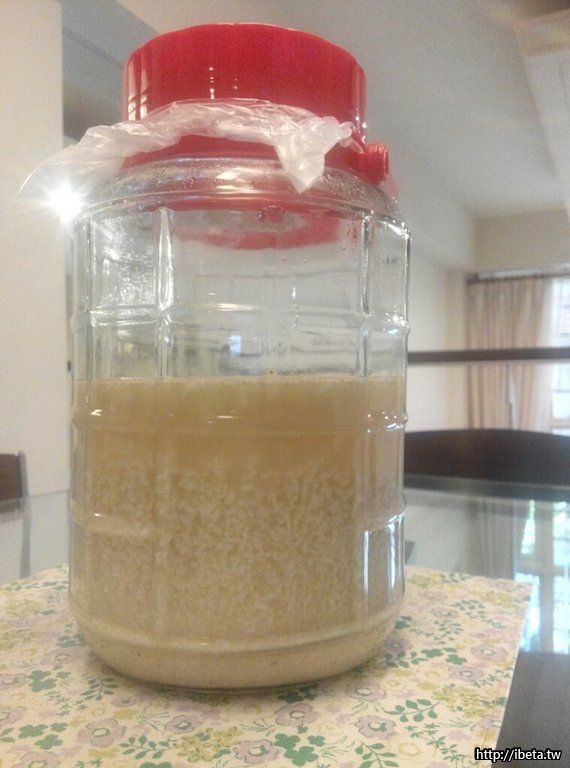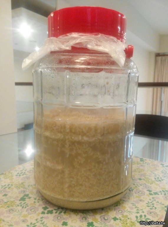 [半固半液]:熟糧佈麴澱粉水解後,再加稀釋水。讓榖糧澱粉一次反應完,省時、風味尚可、過程中又有副產品(後述),適合居家自釀的方式。後續,即是此法。