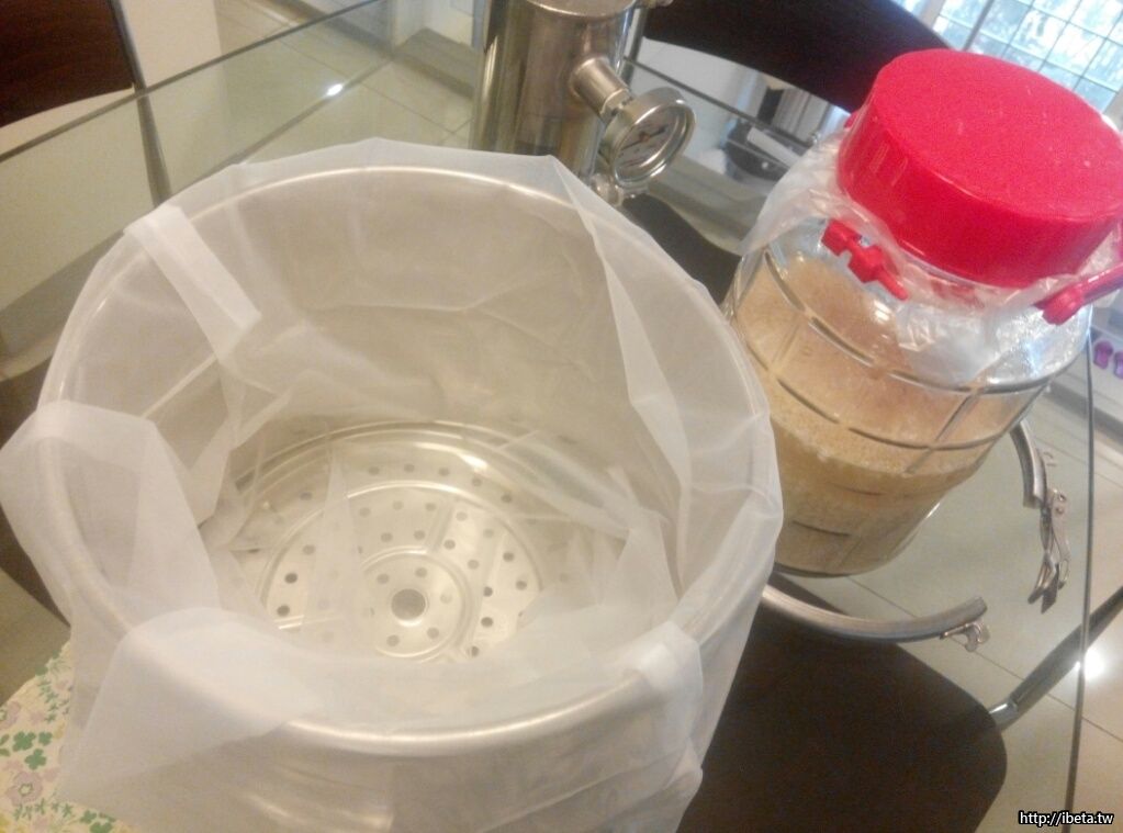 〘副產品一〙如果不喜喝烈白酒,在此階段過濾裝瓶,濃白的酒液即是原住民10%~15%vol的小米酒,若一時間無法喝完,需做滅菌的處理。[滅菌]是要消滅瓶中的酵母菌,以免持續發酵,倒出的小米酒會冒泡,嚴重的會爆瓶!滅菌的方式是裝瓶後浸泡在65~70℃的熱水中,切記不可超過酒精的沸點78度,又不可低於蛋白質的轉化溫度60度。