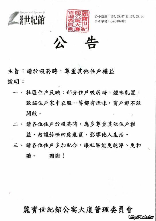 公告 107020 請於吸菸時,尊重其他住戶權益