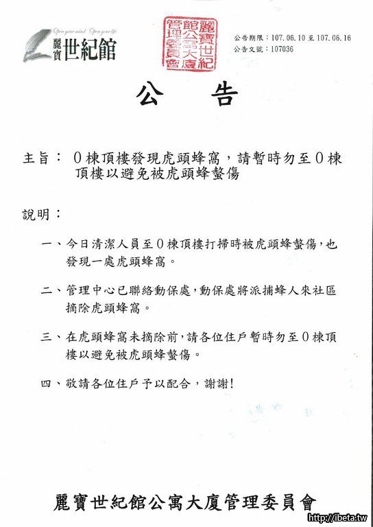 公告107036 O棟虎頭蜂出沒