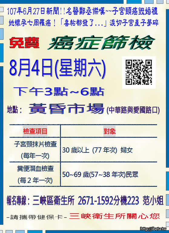 三峽衛生所8月份免費社區健康篩檢場次