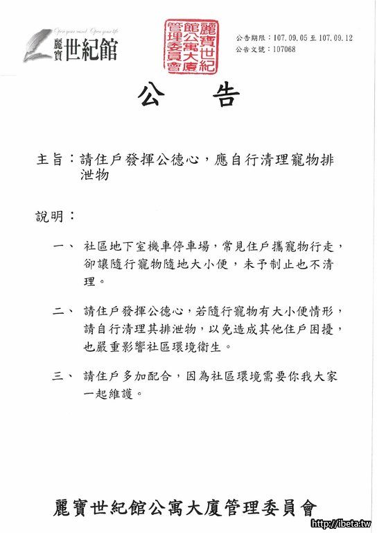公告 107068 請住戶發揮公德心,應自行處理寵物排泄物