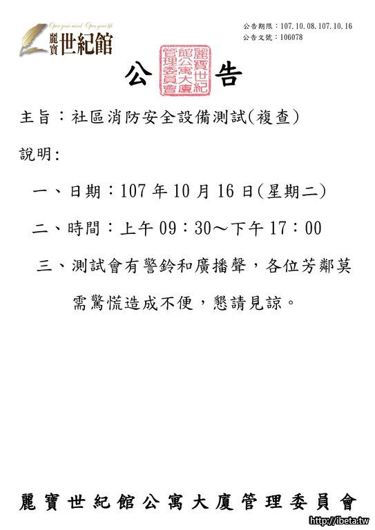 公告 106078 社區消防安全設備測試(複查)