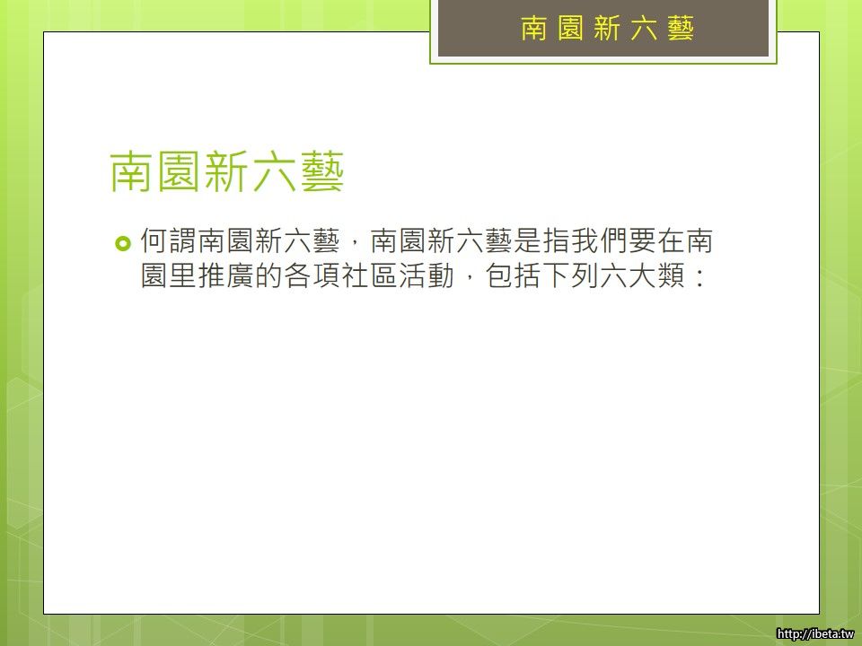 何謂南園新六藝,南園新六藝是指我們要在南園里推廣的各項社區活動,包括詩、書、禮、樂、易、春秋六大類。南園新六藝雖然名稱與儒家六經完全相同,但配合時代轉變,在內容上仍有增刪與變革。