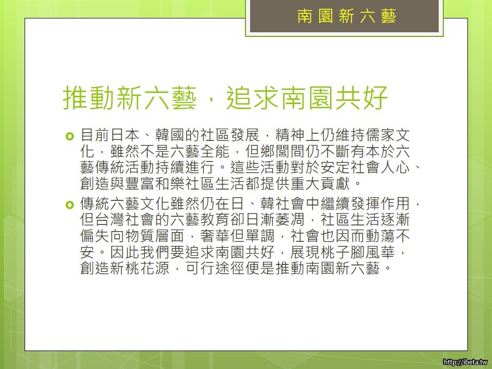 禮失求之野,傳統六藝文化雖然仍在日、韓社會中繼續發揮作用,但台灣社會的六藝教育卻日漸萎凋,社區生活逐漸偏失向物質層面,奢華但單調,社會也因而動蕩不安。因此我們要追求新桃花源,展現桃子腳風華,創造南園共好,可行途徑便是推動南園新六藝。