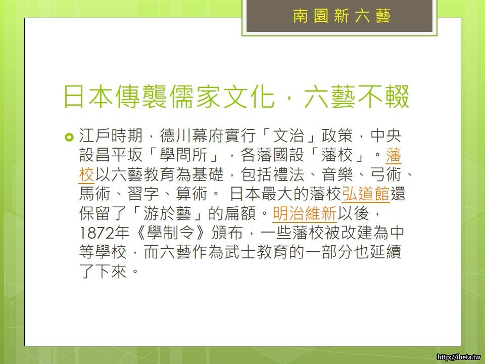 日本傳襲儒家文化,六藝不輟,江戶時期,德川幕府實行「文治」政策,中央設昌平坂「學問所」,各藩國設「藩校」。藩校以六藝教育為基礎,包括禮法、音樂、弓術、馬術、習字、算術。 日本最大的藩校弘道館至今還保留「游於藝」的扁額。明治維新以後,1872年《學制令》頒布,一些藩校被改建為中等學校,但六藝作為武士教育的一部分仍被延續了下來。