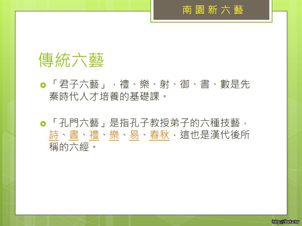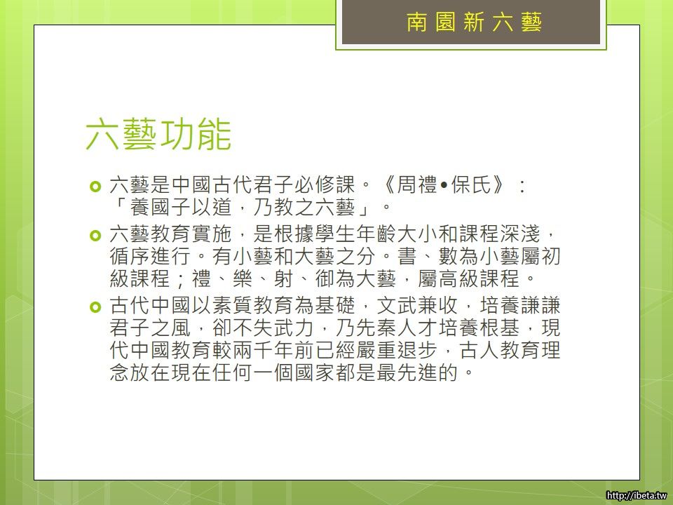 六藝是中國古代君子必修課。《周禮•保氏》:「養國子以道,乃教之六藝」。周禮所列的六藝是指「禮、樂、射、御、書、數」,這是一種培養文武全才的全人教育,以素質教育為基礎,文武兼備,既培養謙謙君子德風,卻不失武力體能操練,乃先秦人才培養根基。孔子則承襲了周禮六藝,將之發揚轉變成儒家六經,「詩、書、禮、樂、易、春秋」,締造了中華文化中最堅固礎石,也讓中華禮義之邦美名千古傳承。