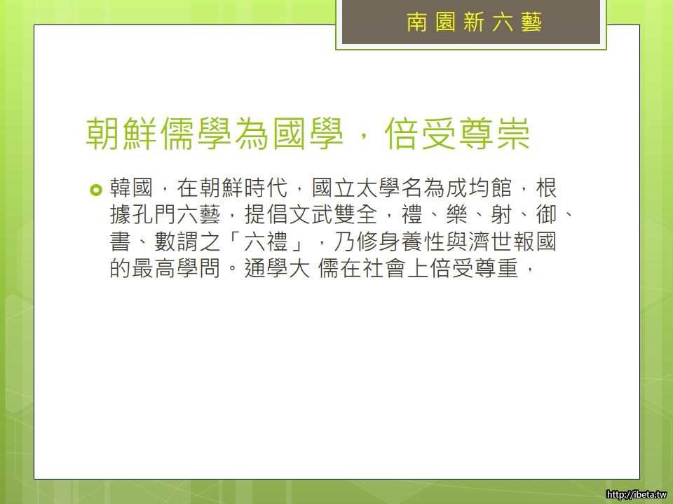 而韓國更是自許為儒家傳人,在朝鮮時期,儒學貴為國學,倍受尊崇,國立太學名為成均館,根據孔門六藝,提倡文武雙全,禮、樂、射、御、書、數謂之「六禮」,乃修身養性與濟世報國的最高學問。通學大儒在社會上更倍受尊重,