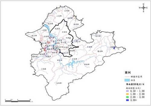 以下4張圖分別是單日24小時降雨量為150mm、300mm、450mm跟600mm時,可能淹水區域的示意圖,很明顯的,即使單日降雨量達到600mm,三峽也沒有淹水的迫切危機,代表三峽比較不用擔心降雨量過大帶來的淹水危險,但大漢溪以及石門水庫仍然值得我們注意。