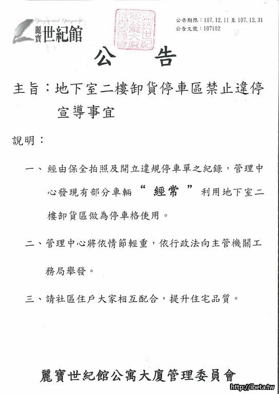 公告 107102 地下室二樓卸貨停車區禁止違停宣導事宜
