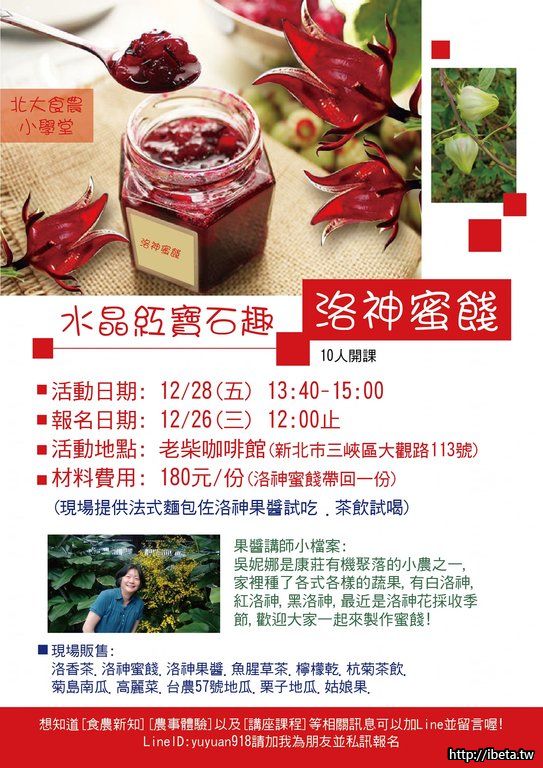 材料費用:一份180元 (洛神蜜餞的材料、果醬、玻璃罐等包材),親子可共同製作一份或二份以上,請於報名時告知您需要的材料份數!
