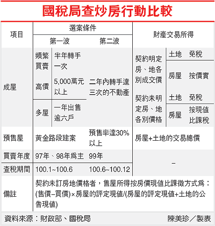 財政部要求國稅局需在今年7月前,呈報第一波查炒房的成果。官員指出,第一波查炒房行動已讓捐機關「熱過身」,第二波查炒房將更具火力。財政部提醒民眾,過去兩年若買賣成屋或預售屋,應誠實申報所得稅,以免被列為選查對象。