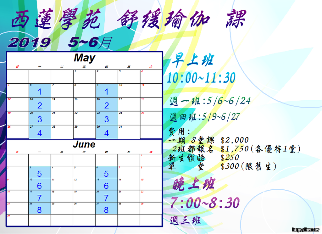 時間:每週一.四早上10:0~11:30.每週三晚上7:00~8:30