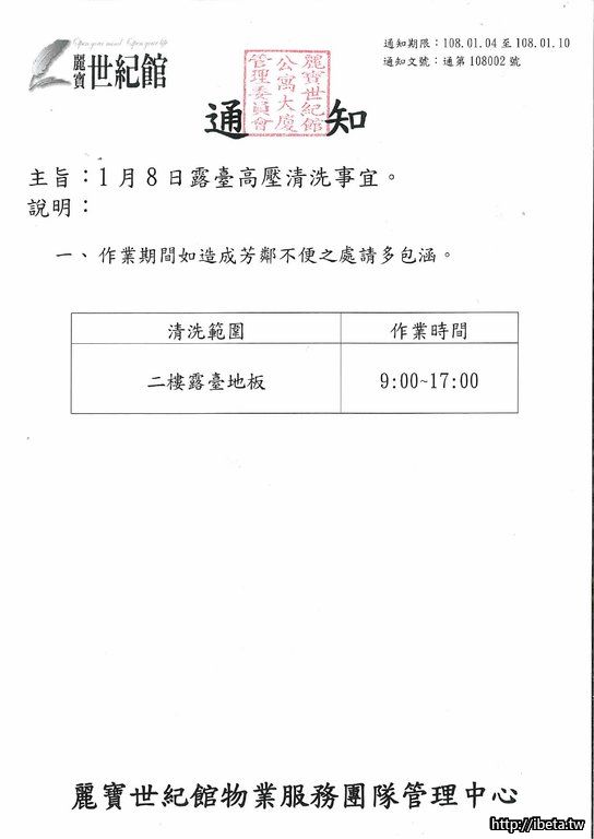 通知108002 1月8日露臺高壓清洗事宜