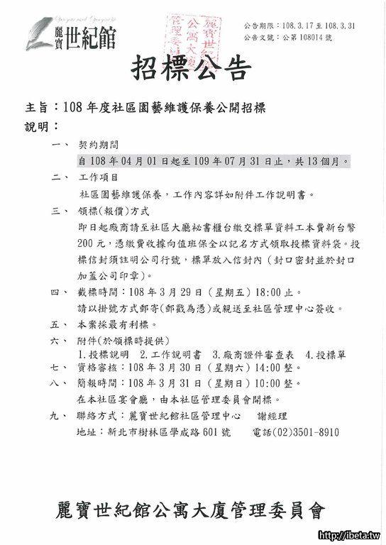 公告文號108014 108年度社區園藝維護保養公開招標